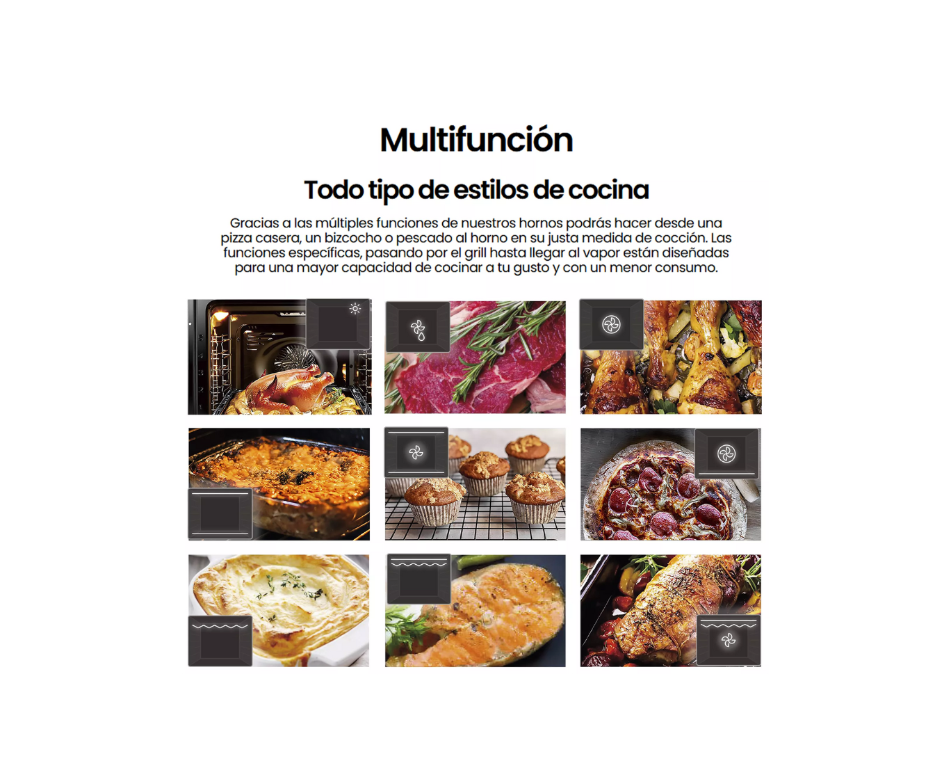 Gracias a su sistema multifunción, conseguirás resultados homogéneos, crujientes y sabrosos en todo tipo de platos.