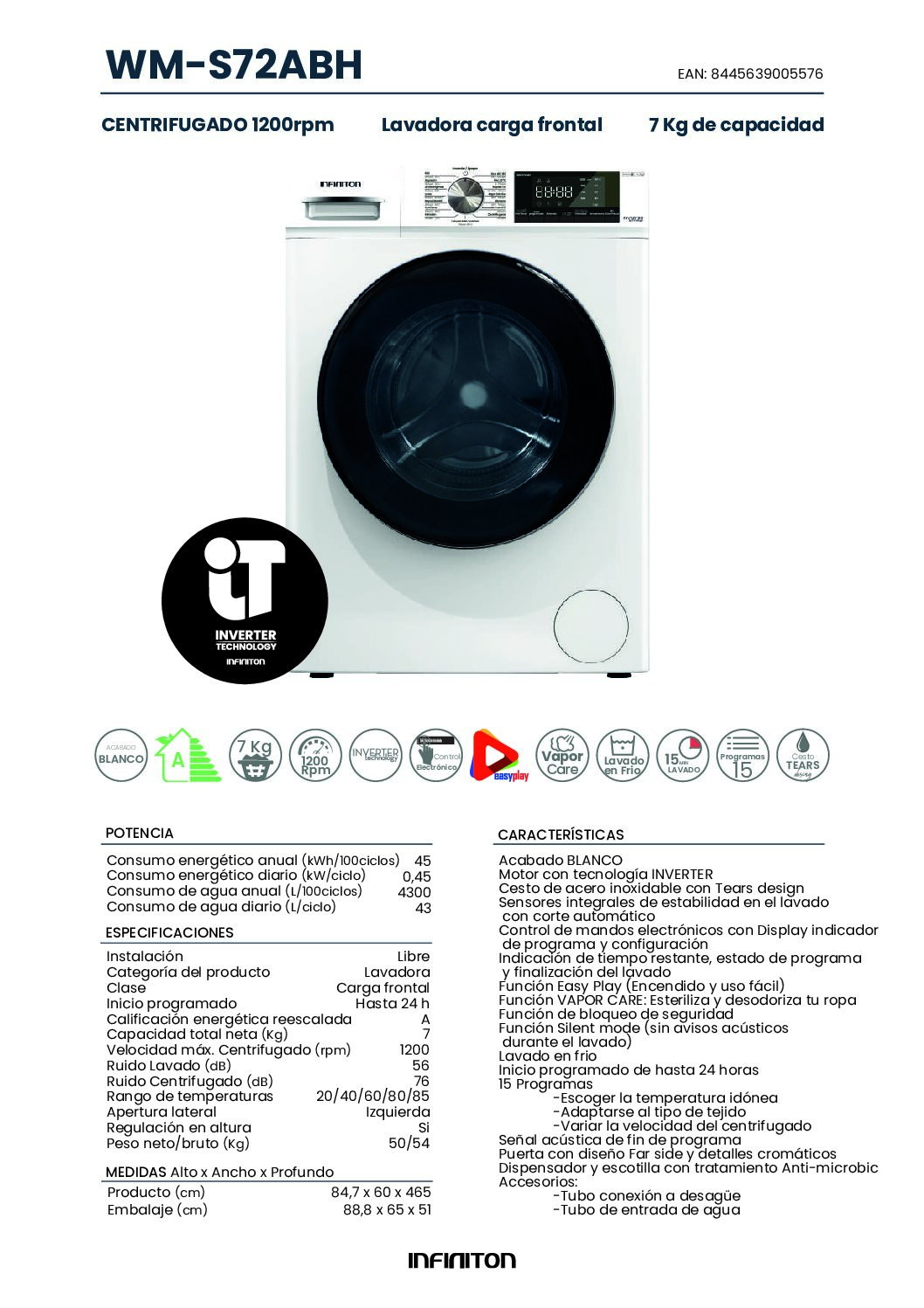 MODELO: WMS72ABH// CAPACIDAD//7KG //CENTRIFUGADO 1200RPM//CERTIFICADO ENERGETICO: A